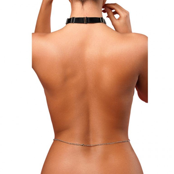 Чокер регулируемый, что позволяет добиться идеальной посадки и и сключает эффект удушения. К чокеру прикреплено кольцо с цепями, которые пикантно проходят вдоль ложбинки. Спинка открыта!